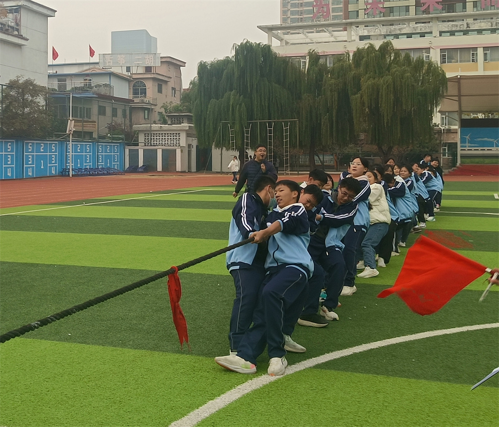 随着裁判一声哨响,比赛正式拉开帷幕。霎时间,赛场上下气氛热烈,呐喊声、助威声此起彼伏,成为赛场边一道温暖的风景。只见学子们紧握长绳、重心后移,脚步稳稳扎根地面,脸庞因发力而涨红。绳子中间的红线在两队间来回拉锯,每一次向后拉扯,都是对团队默契的考验;每一寸红线移动,都凝聚着全班同学的期盼。这根普通的长绳,此刻成了连接少年心意、凝聚班级力量的纽带。