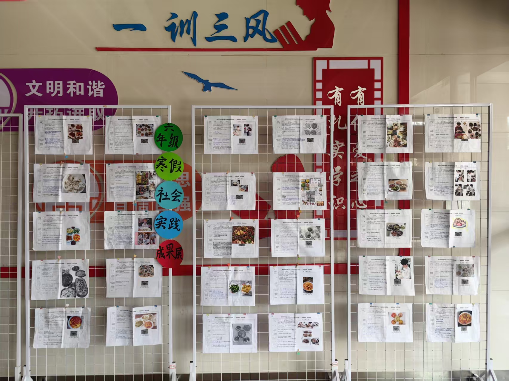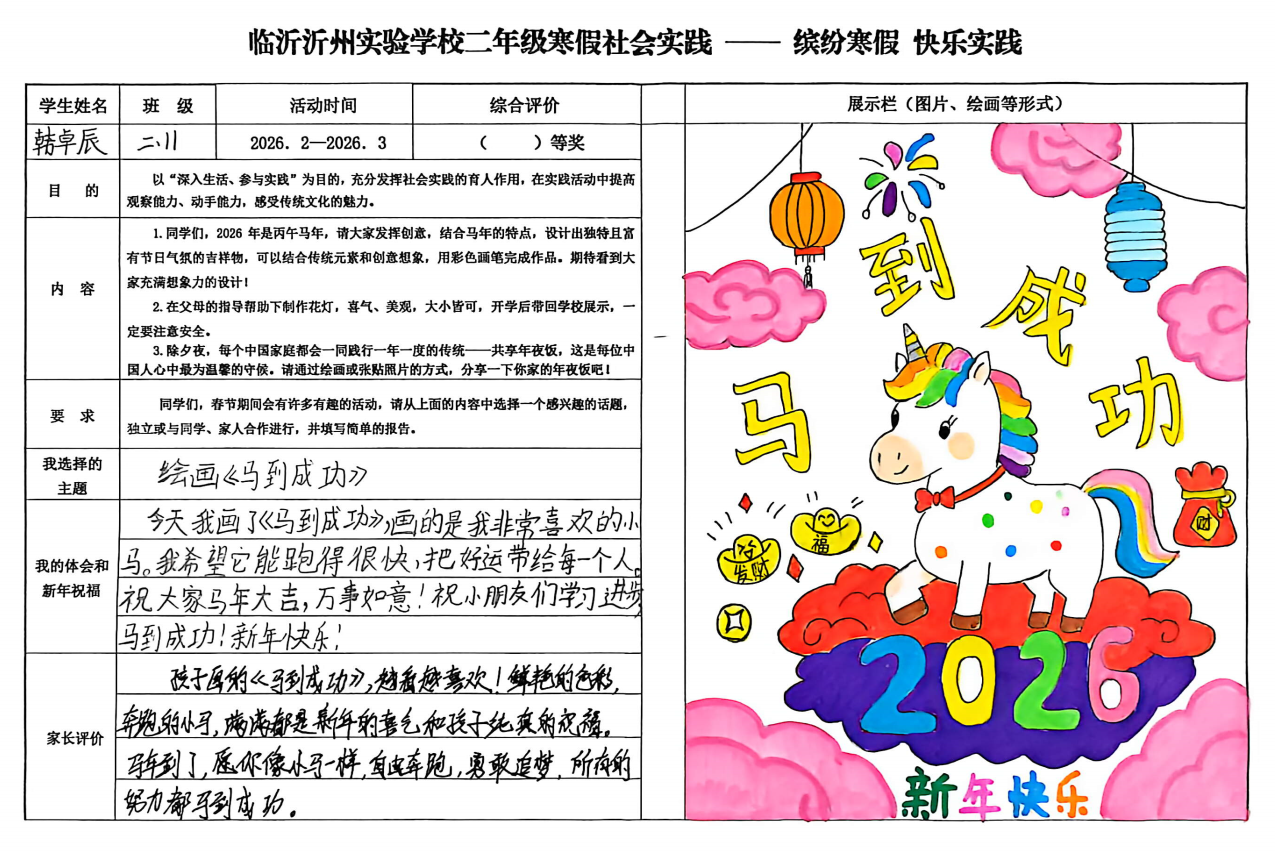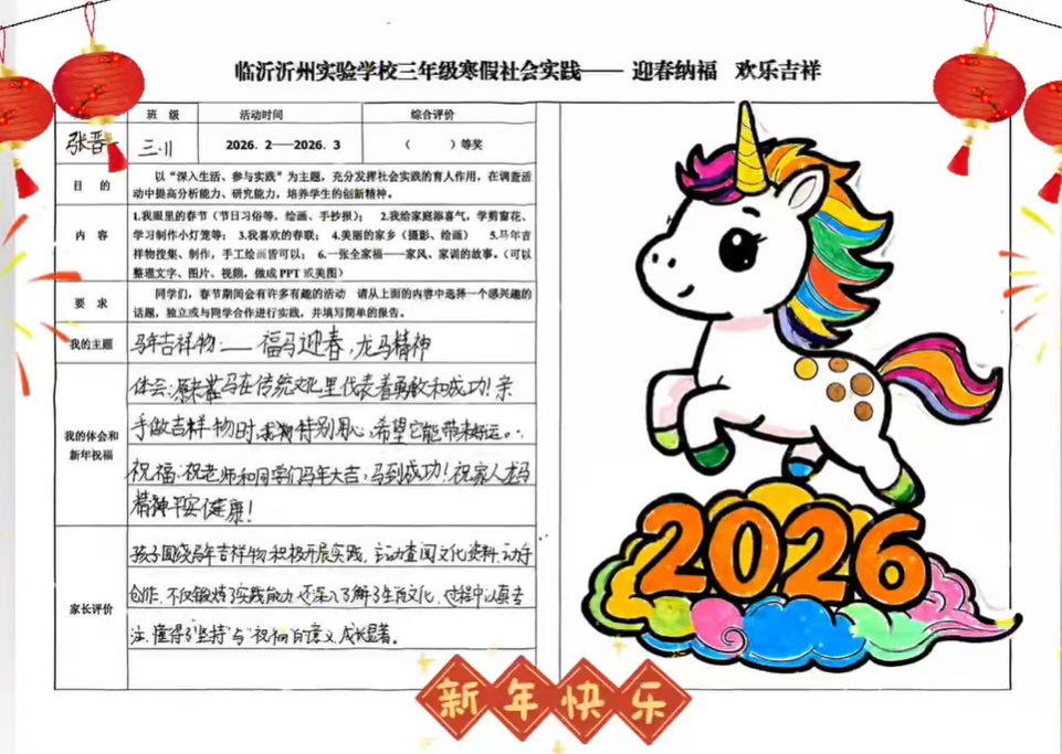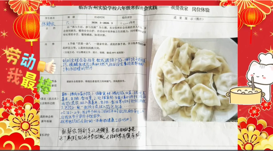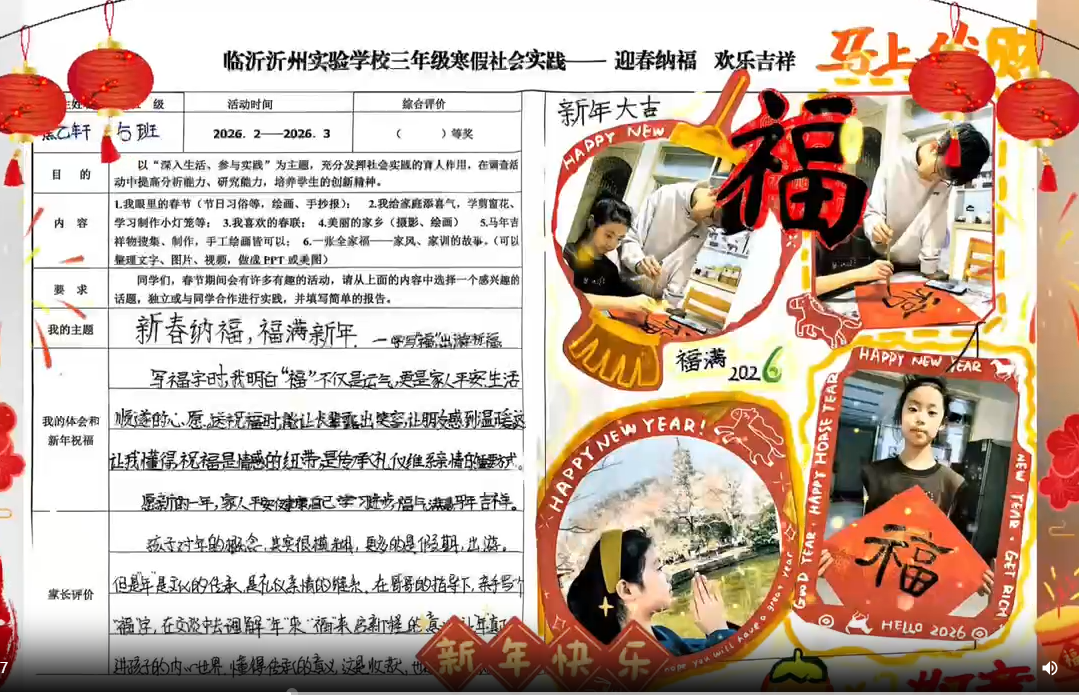 本次展览汇集了同学们在假期中的创意成果。五彩斑斓的灯笼悬挂在枝头,满是浓郁的年味儿。从马年剪纸到充满年味的手抄报,从手工制作的灯笼到家风故事的分享,再加上同学们的劳动成果——拿手好菜,每一件作品都展现出同学们的童真与巧妙构思,体现了他们对传统文化的热爱。