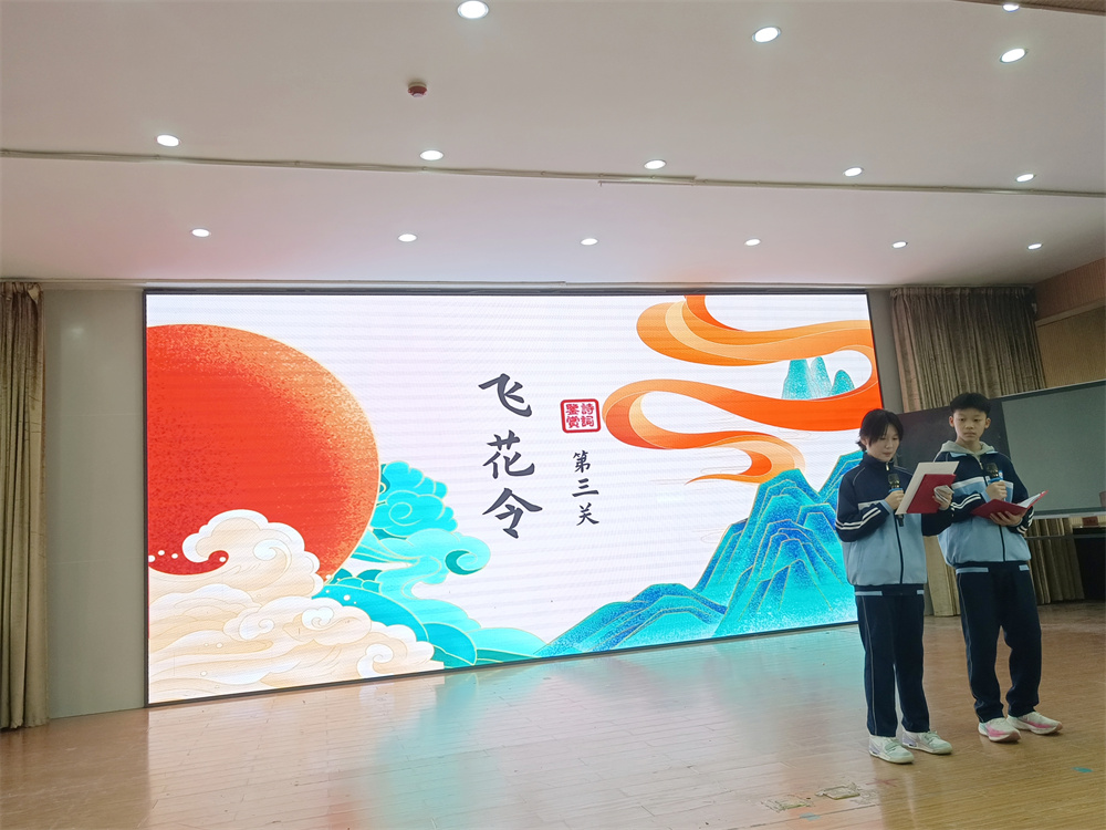 第三关“飞花令” 将比赛推向高潮。团体一等奖班级各派两名代表、二等奖班级各派一名代表,共24人分成4组,每组6人抽签定字,按顺序在10秒内吟出含指定字的诗句,答不出即淘汰,每组第一名晋级决赛,最终决出状元、榜眼、探花、传胪及进士单项荣誉。选手根据抽选字眼逐轮对决,你来我往、佳句频出,尽显个人诗词功底与临场应变能力。