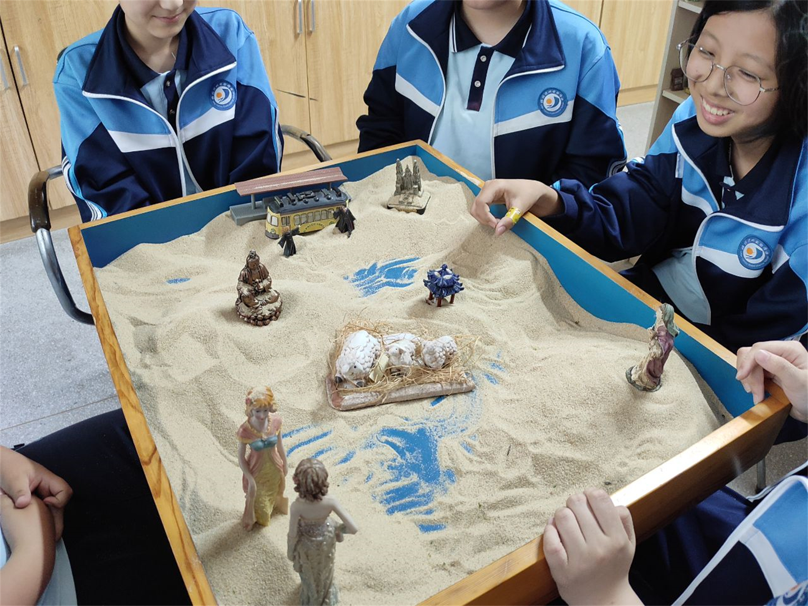 “一沙一世界”,一个个沙世界在同学们的手中呈现,同学们在体验创作乐趣的同时放松身心、探索自我、了解他人、深入交流,学会了倾听他人、尊重接纳,促进了自我成长与良好人际关系的建立,从而提升了心理健康水平。