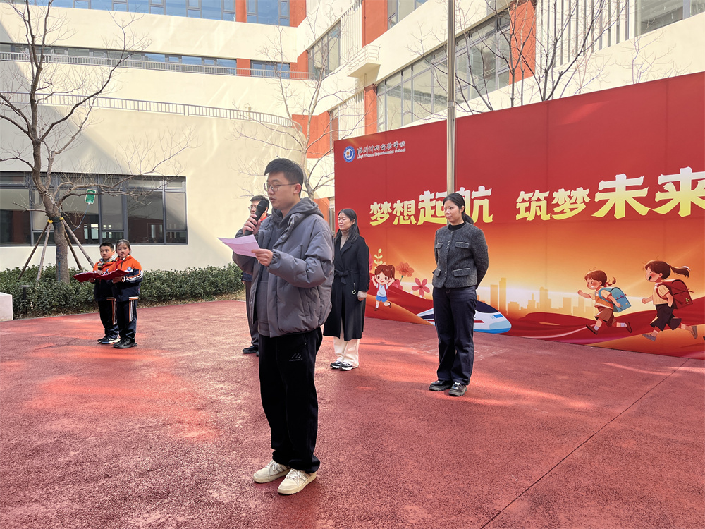 在激昂的国歌声中,五星红旗冉冉升起,全体师生庄严肃立,向国旗行注目礼,高唱国歌,爱国之情在每个人心中涌动。