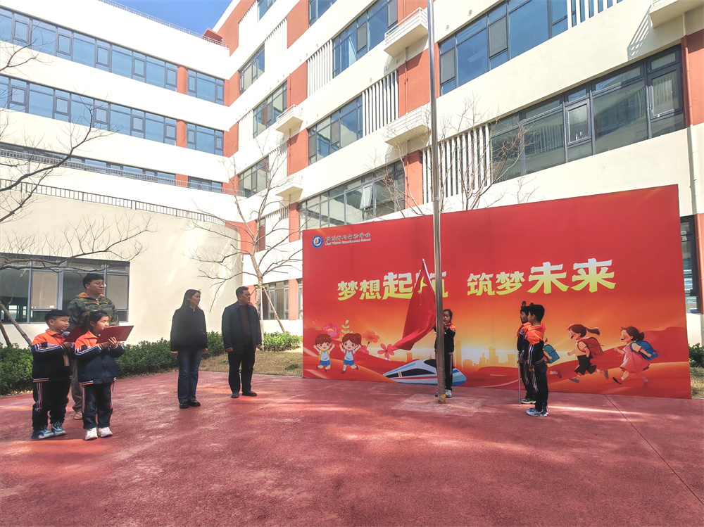 阳光洒满校园,全体师生齐聚操场。伴随着激昂的出旗曲,护旗手们迈着整齐有力的步伐护送国旗走向升旗台。师生庄严肃立,向国旗行注目礼。在雄壮的国歌声中,五星红旗冉冉升起,迎风飘扬。