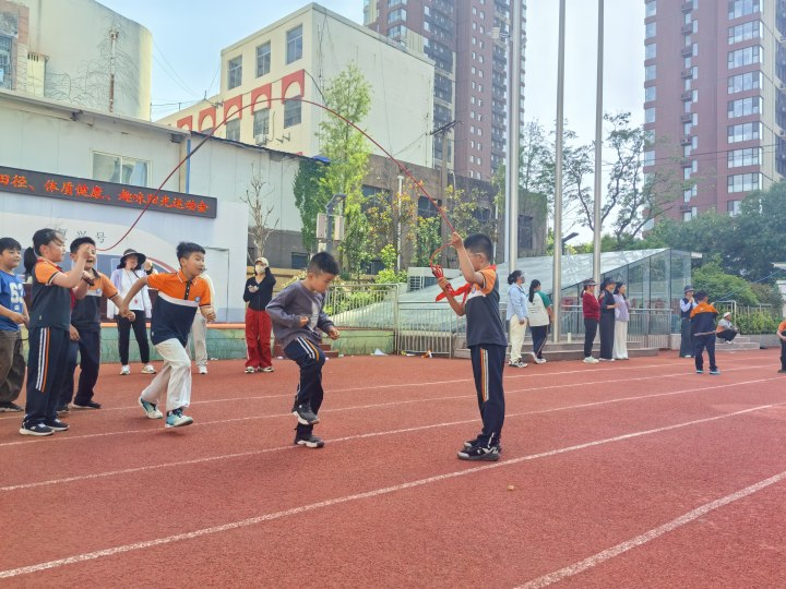 跳绳比赛赛场上,团体跳绳比赛“十人八字”更为紧张激烈,各班同学身轻如燕,脚尖轻点地面,跳绳在他们手中飞速转动,让人看得眼花缭乱。只见他们双手紧握绳子,将现场的气氛推向了最高潮。