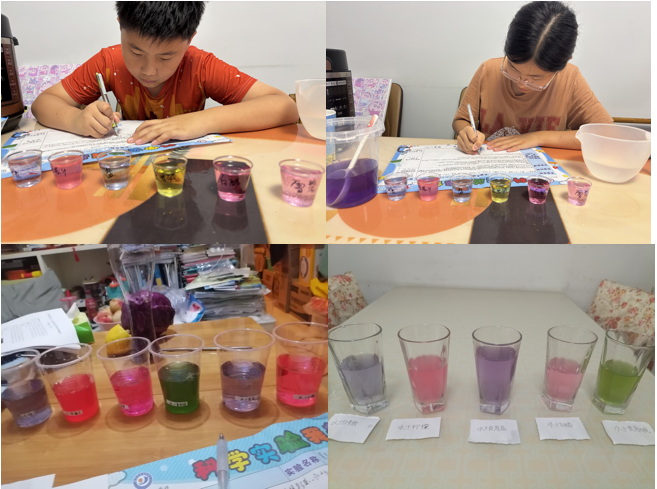 对于小学以及七、八年级的同学们来说,厨房变成了他们的第一实验室,而紫甘蓝,就是他们的“魔法试剂”。孩子们亲手榨取紫甘蓝汁,用它来检验家中常见的液体:白醋的酸让它变成了娇艳的红色,肥皂水的碱让它呈现出深邃的蓝色或绿色,纯净水则保持了它原本的紫色……一杯杯色彩斑斓的液体,不仅是视觉的盛宴,更是知识的直观体现。九年级的同学们则迎接了更高阶的挑战——用橡皮泥制作过氧化汞和氧化汞的微观分解示意图。这不仅是手工活,更是一次对化学反应本质的深度思考。红的、白的、黑的小小橡皮泥球,在同学们灵巧的手中,变成了一个个氧原子和汞原子。他们精心组合,搭建出过氧化汞的分子结构,再通过“分解”过程,将其重新排列成氧化汞分子和氧分子。这个过程,让抽象的化学方程式变得触手可及。小学以及中学七、八年级交出了42份视频,六百多份纸质实验材料,其中233名学生获最佳科学探索奖,452名学生获科学探索家,九年级的同学交出了522份充满创意与智慧的作品,每一件都是对化学原理的独特诠释。