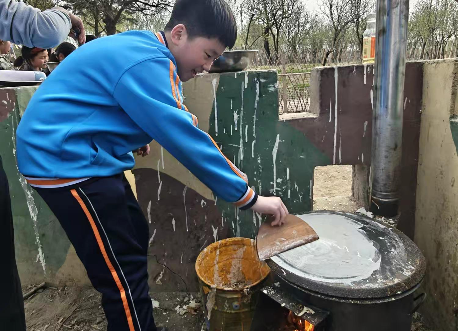 最具沂蒙味道的,是野炊烙煎饼。烟火袅袅、暖意浓浓,同学们围在鏊子旁,学着摊面糊、转煎饼,手法从生疏到熟练,笑容从紧张到舒展。大家在亲手劳作中,品味一粥一饭来之不易,在烟火气里读懂最朴素的沂蒙心。
