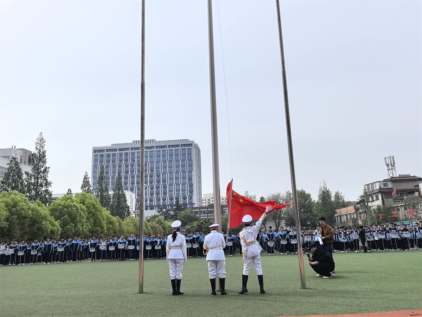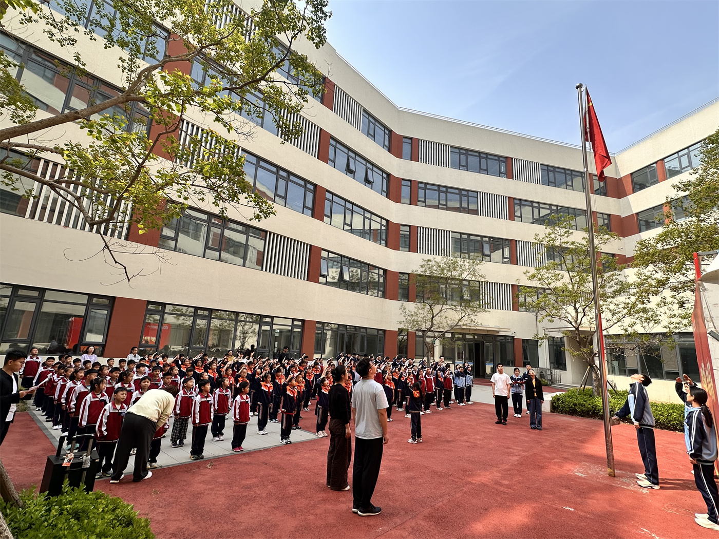 清晨,伴随着雄壮嘹亮的《义勇军进行曲》,五星红旗在各校区冉冉升起,迎风飘扬。少先队员行队礼,师生行注目礼,嘹亮的国歌声在各校区操场激荡,浓浓的爱国情怀在每个人心中升腾。