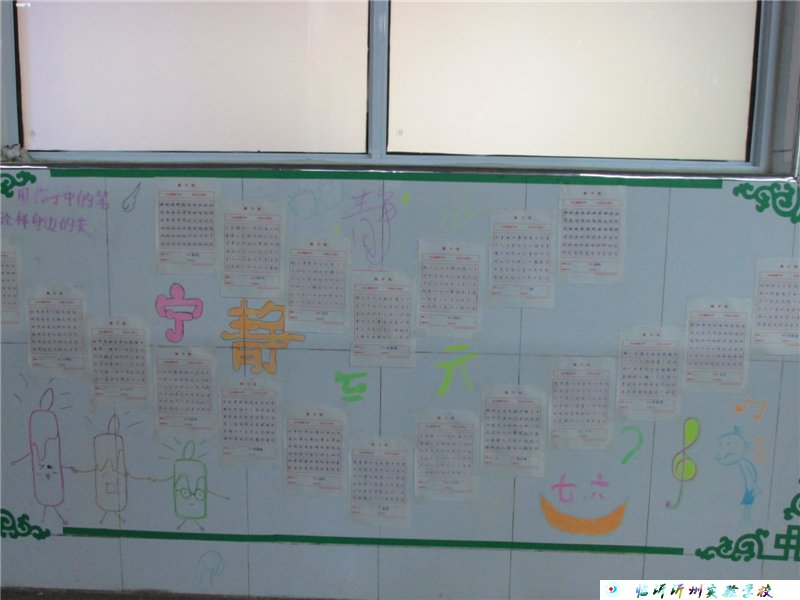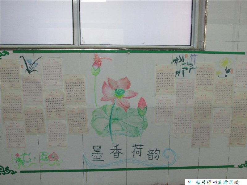 每班内部都设立了展示栏,如:“书法楷模”、“书法园地”、“班级书法阵地”等等。每天展示部分学生优秀作品。建立了班级书法文化的窗口,注重教室外墙书法文化的建设。各班在教室外墙开辟书法专栏,每周举行一次练字成就展,把学生的优秀书法作品张贴在教室外墙壁上。通过展览,让被选到展览练字作品的学生对自己写的字更加自信,让没有选到的学生来学习,勤奋练字提高书法水平。