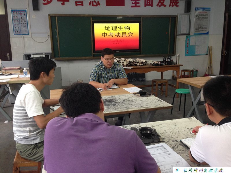 为了更好地完成2015年地生的中考工作,三学段积极谋划,提前计划,在段主任的领导下召开了地理生物动员会议,认真做好八年级生地中考动员工作 。