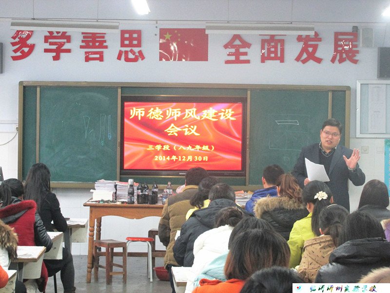 为了深入学习党的十八届四中全会精神,贯彻落实学校元旦春节期间师德师风建设的工作要求,三学段于2014年12月30日下午在书法教室召开了师德师风建设会。刘淼主任、王蕾副主任、曲寿刚书记及三学段八九年级全体教师参加了会议。