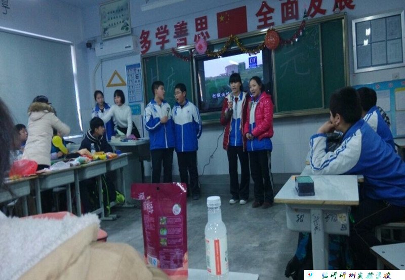 为加强班集体的凝聚力建设,缓解中考年级学生压力,创建民主融洽的师生关系,形成健康和谐的校园氛围,营造欢乐祥和的节日气氛,2014年12月31日下午,三学段八九年级各班精心组织了庆元旦联欢活动。