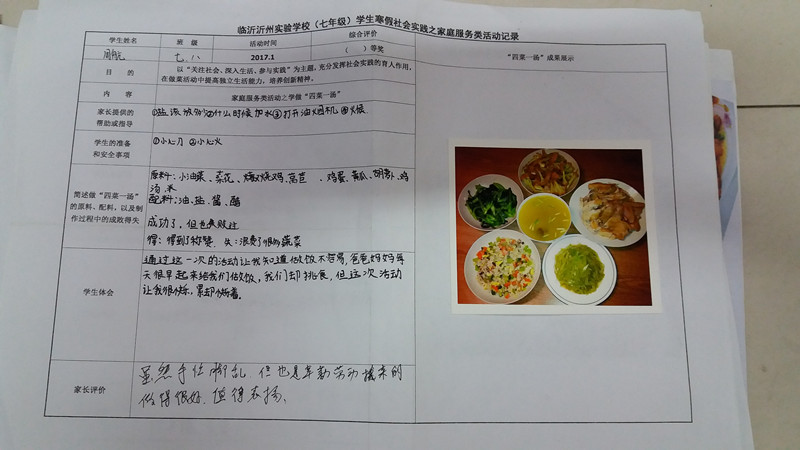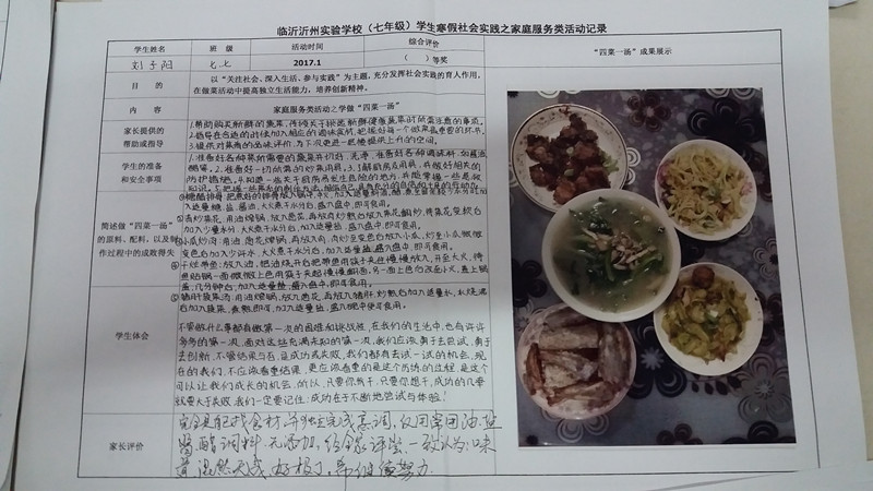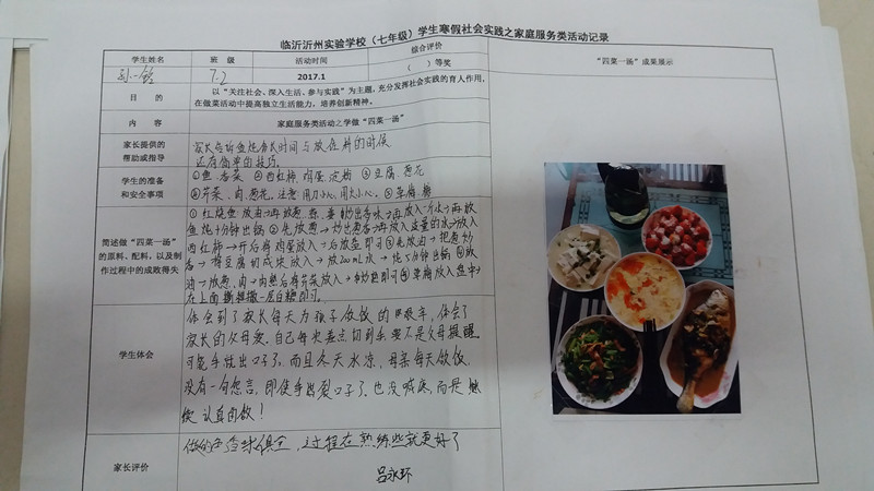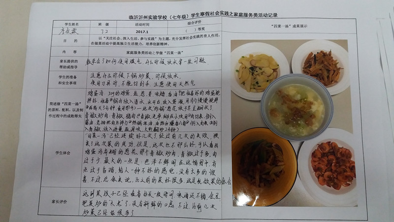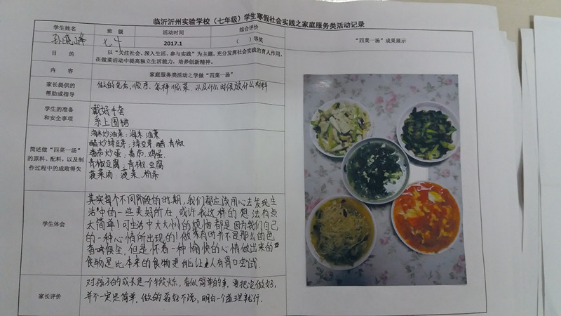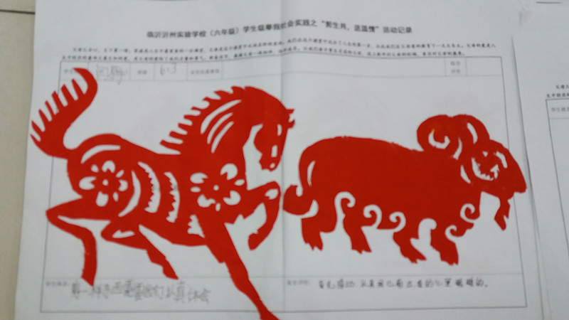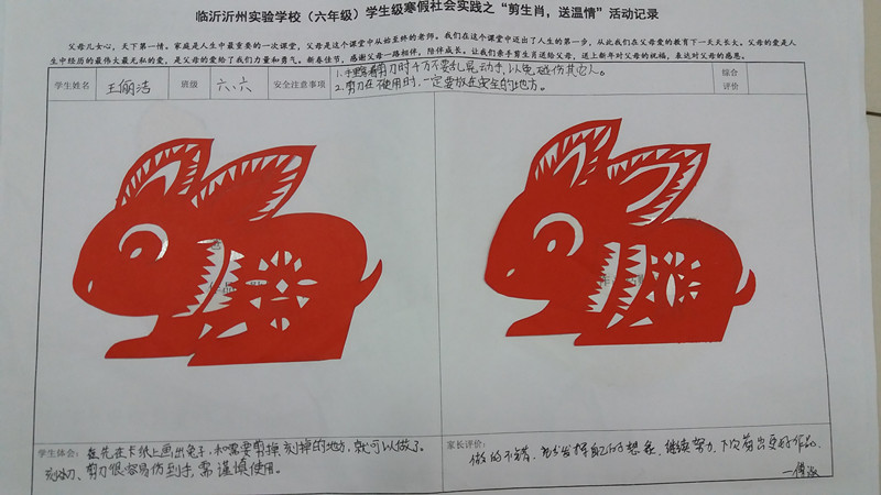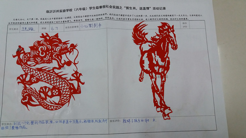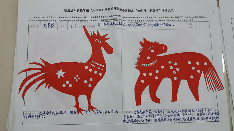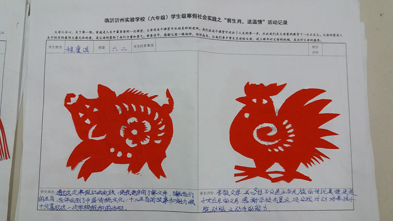 寒假期间,三学段给六七年级学生布置了特色寒假社会实践作业——六年级“剪生肖、送温馨”和七年级“四菜一汤”。
