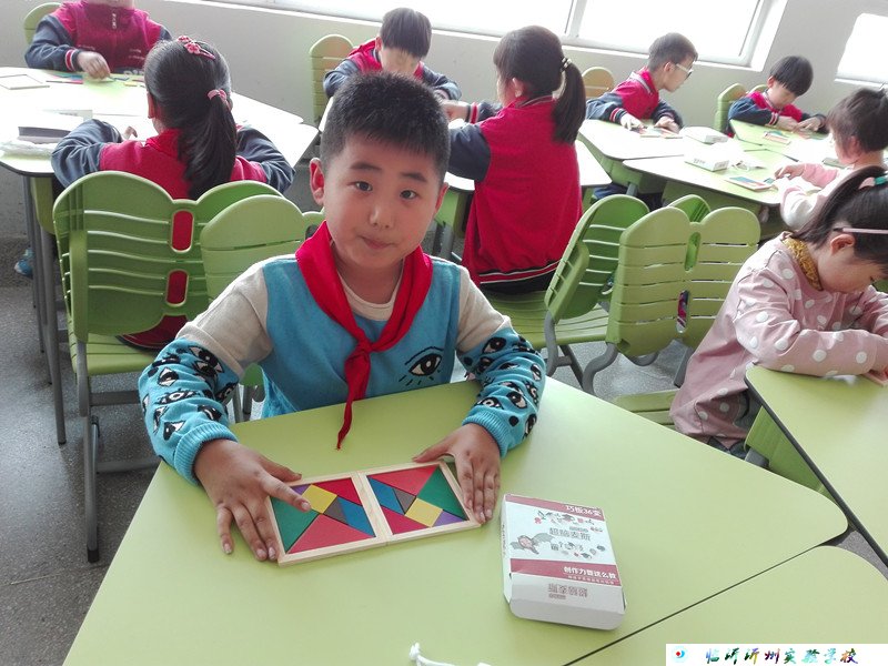 用七块板自由组合,并对作品命名,训练学生的想象能力,笑脸,机器人,帆船,圣诞树……仅仅是七块板,却激发了学生的无限创意。(一学段:王宗美)