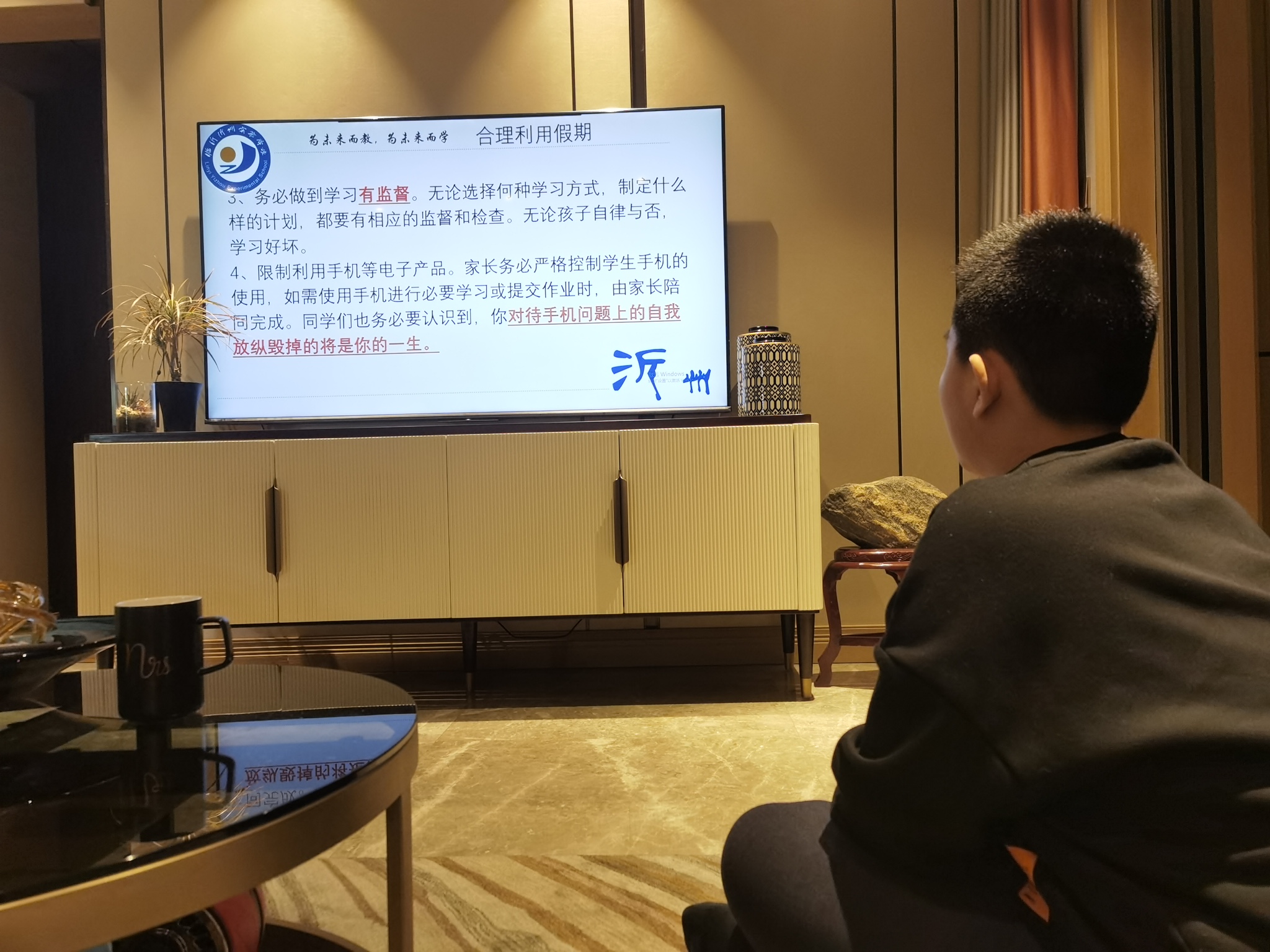 伴随着优美的歌声《一起向未来》,会议正式开始。魏晓军主任从假期疫情防控及安全、期末考试成绩说明、假期学习指导安排、关于孩子的教育、家校共育的建议五个方面和家长进行了交流沟通。