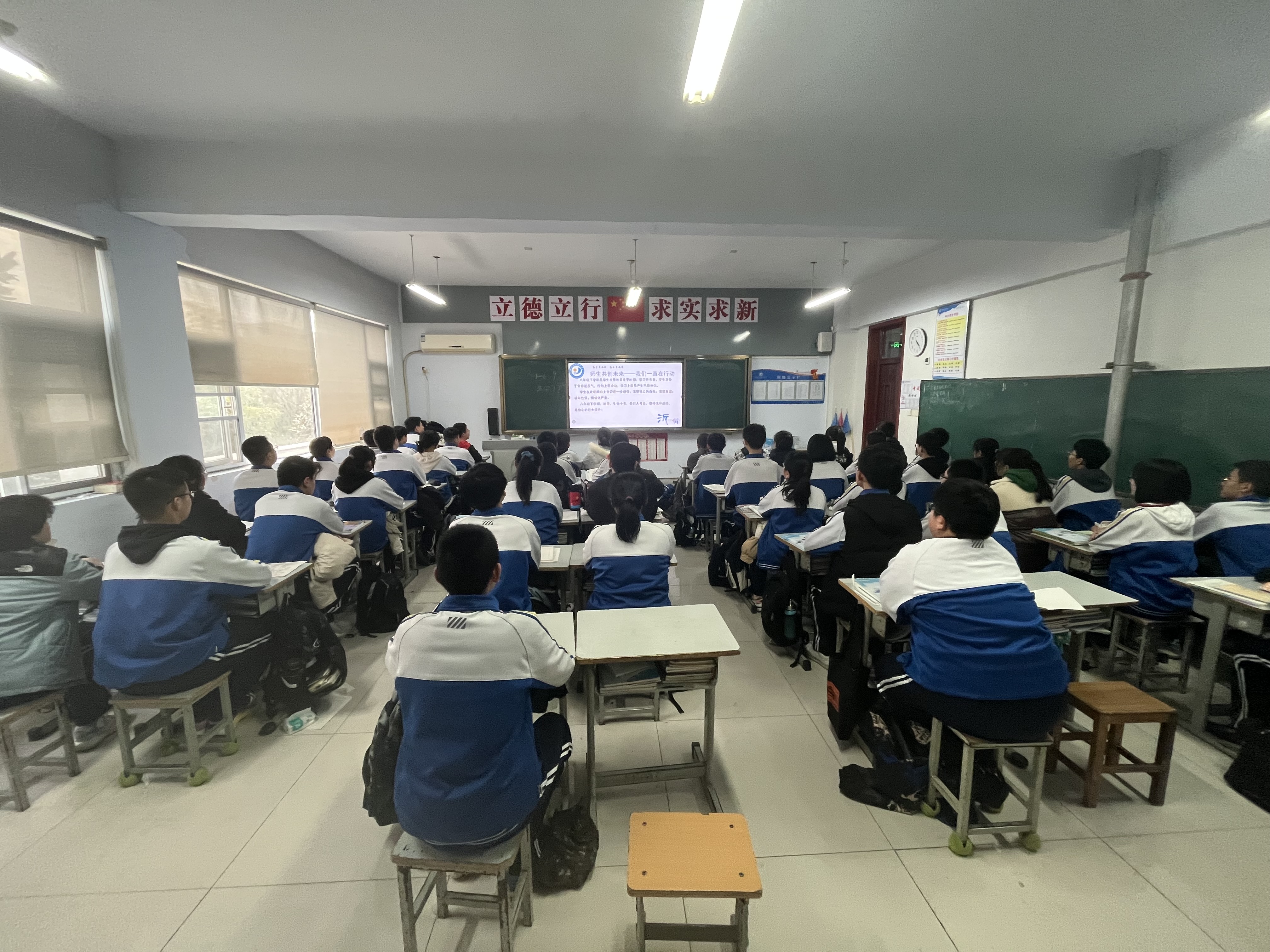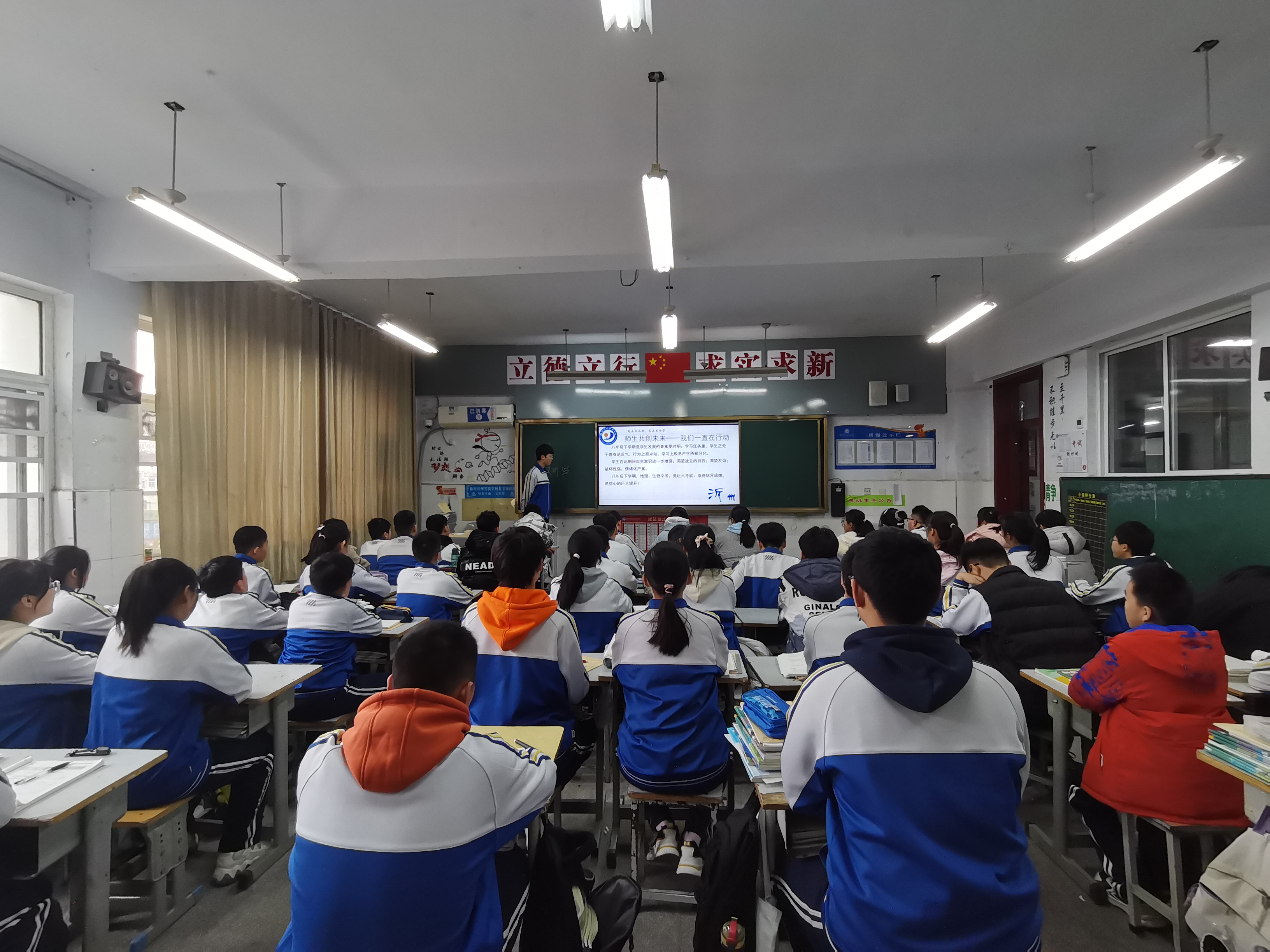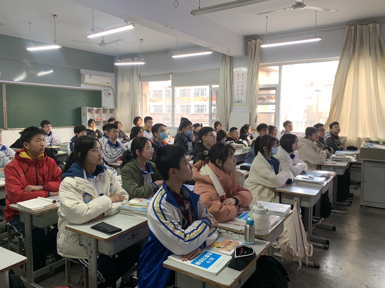魏晓军主任以“新”字为关键词,以“惜时、自信、坚持”为首要要求为本次教育大会作了精彩的开篇。他指出,在面临距离地生中考还有七十二天的紧张局势下,全体同学要积极学习亚洲杯中的中国女足精神,即使是在前半场落后的情况下依然要百折不挠、奋勇拼搏,最终结果定会逆风翻盘,像女足一样将胜利牢牢地握在自己手中。魏主任还借用冬奥会红人谷爱凌的话“我对我所做的事情非常有激情,正因为如此,我需要找到一种方法,来平衡与之相关的其他事情,以确保我有足够的时间保持自律,来完成我必须做的所有事”来告诉同学们谷爱凌能事事做到卓越的原因是自律带来的平衡,使她一步步实现了自己树立的每一个目标。因此同学们也要平衡好学习和生活的关系,该努力的时候努力,明确目标,然后专注、高效地去完成它。随后魏晓军主任为年级的学生分层次进行了准确的成绩目标定位、地理生物中考目标定位,使每位同学明晰了自己的奋斗目标。