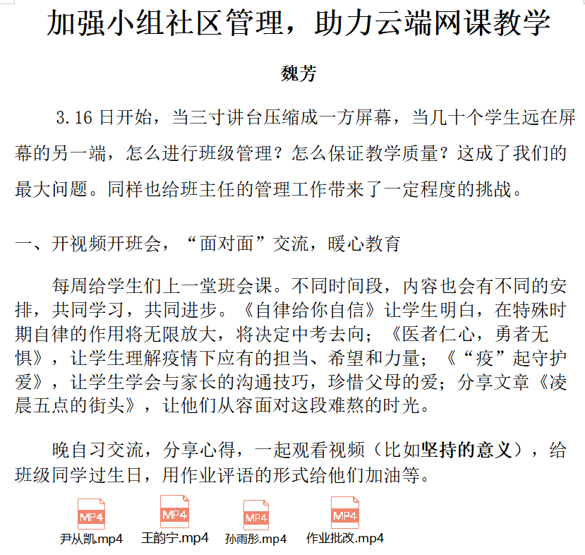 接着,魏芳老师分享了她加强小组社区管理,助力云端网课教学的线上班级管理经验。在线上管理中,她首先做的是开视频开班会,跟学生“面对面”交流,暖心教育,比如晚自习交流,分享心得,一起观看视频(比如坚持的意义),给班级同学过生日,用作业评语的形式给他们加油等。二是制度为先,有章可依,制订并实行规章制度,先讲好规矩:上课时间及时,上课有规则,在有“章”可依的前提下,班上的组长和值日班长值日,每天一通报。及时的督导和严格的问责,让班级管理由开始的松散无序慢慢变得严而有序。三是小组管理,共同成长,这期间培训小组长很重要。尤其是教会他们如何在小组群里起到督促提醒和激励作用。比如以身作则,率先提交作业,为还没有及时完成作业的同学喊加油。也通过公示查看本组作业完成情况,然后提醒未完成者。