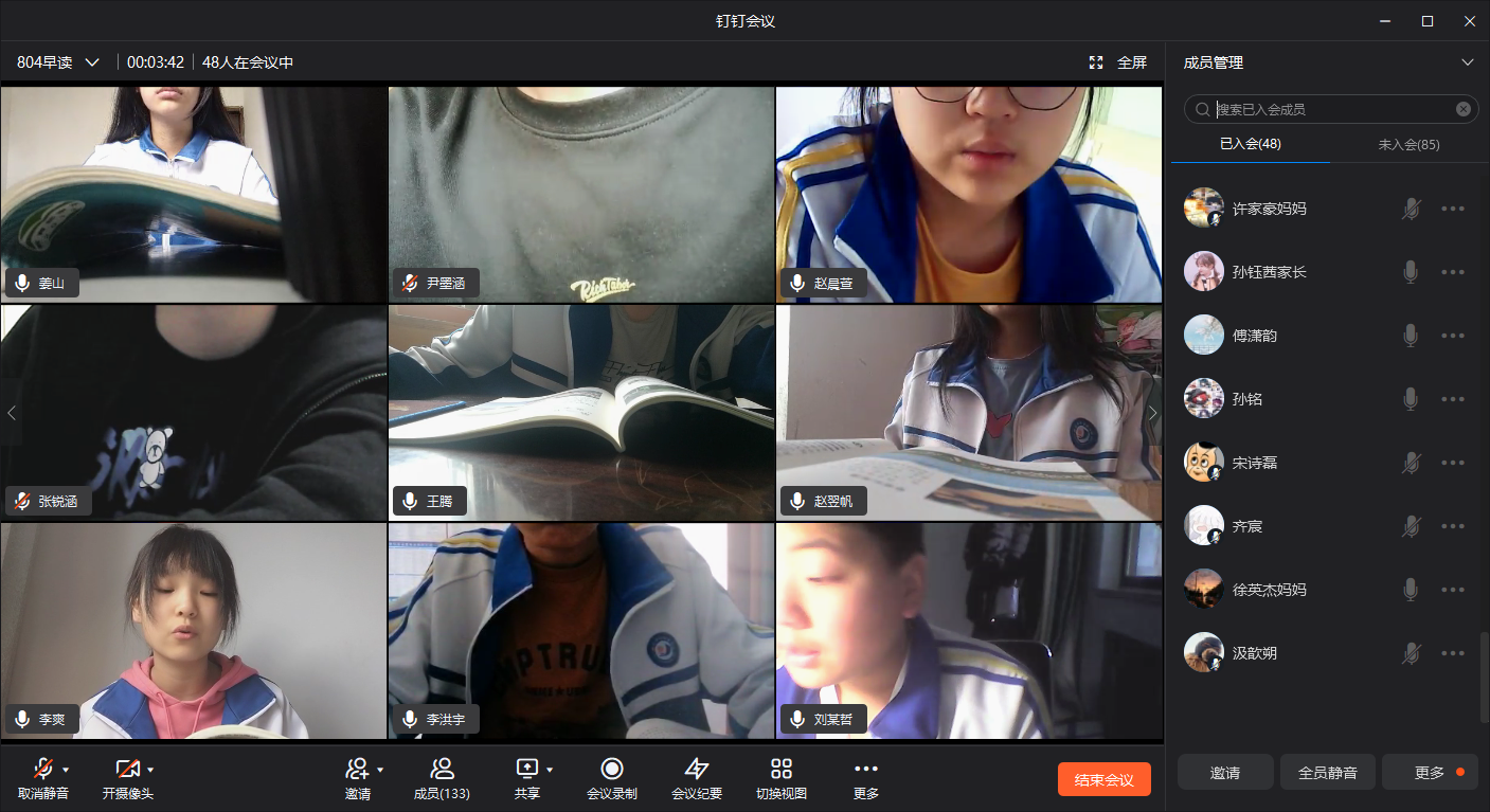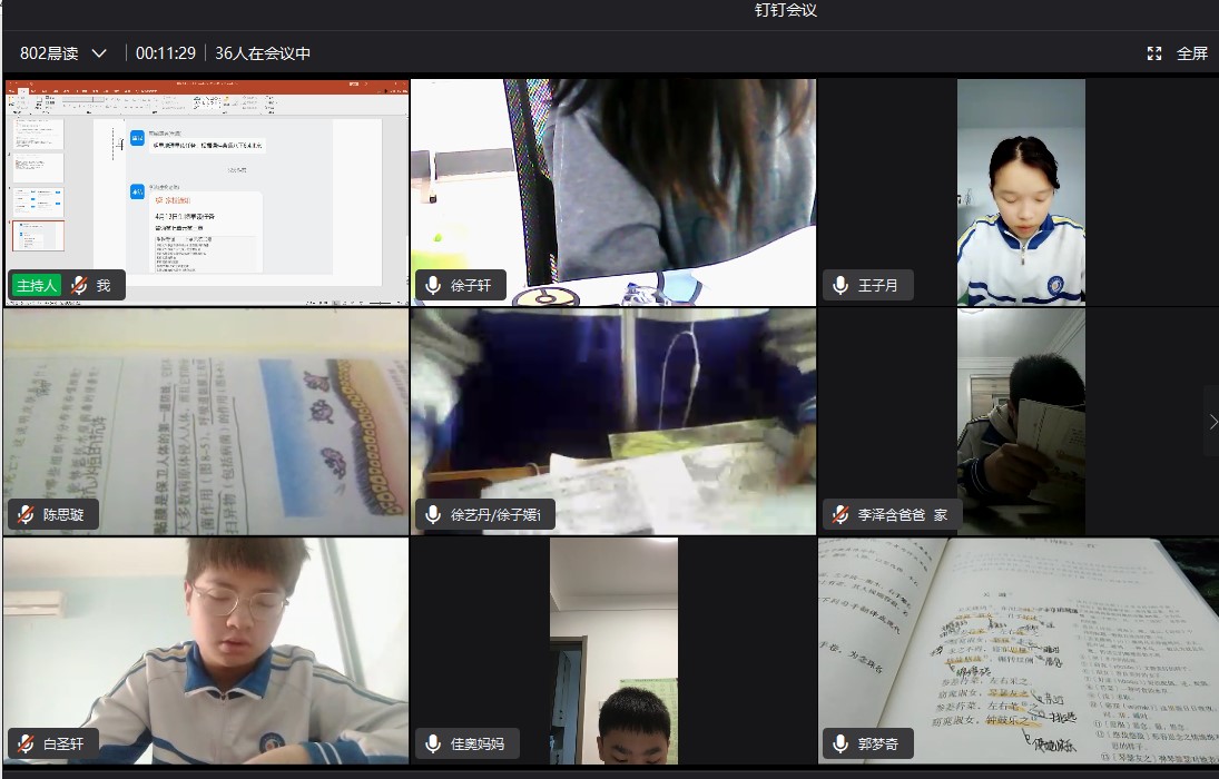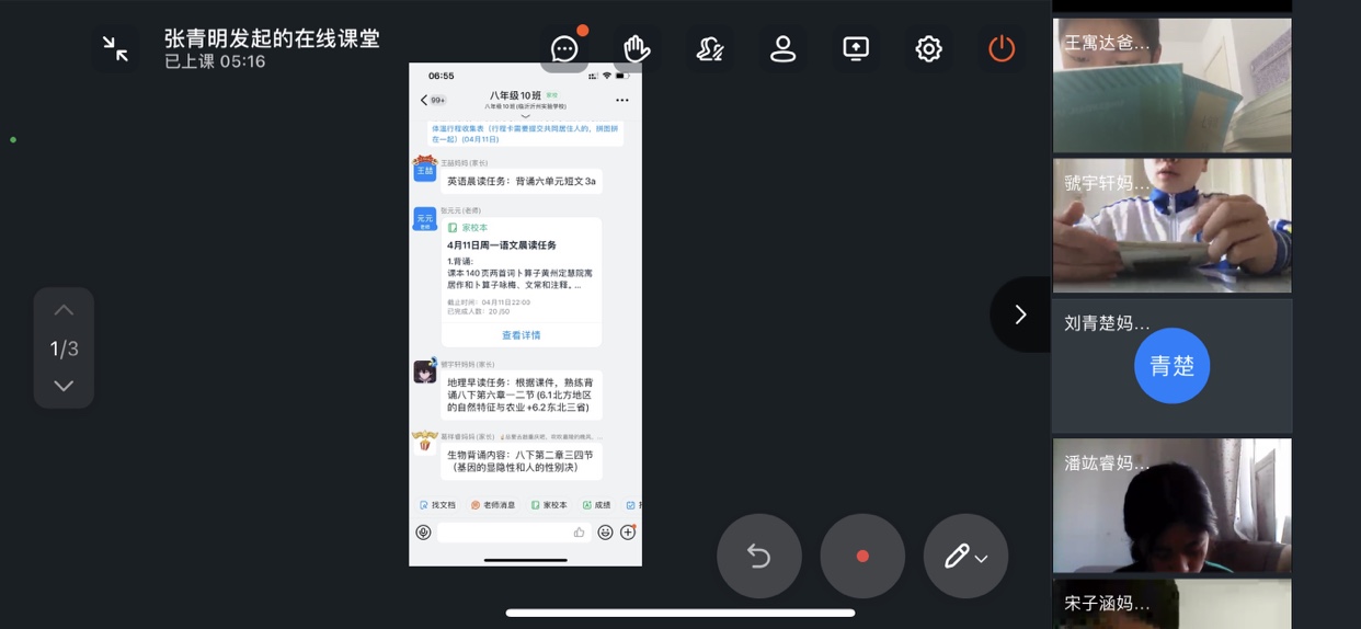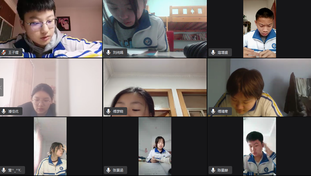 每天从晨读起,班主任们便开始了一天的忙碌,从作业提交,钉钉视频监控,对每一个学生细节的叮嘱……新一轮网课安排让课程变得更加的紧凑,班主任们每节课都会进入到科任老师的课堂,催促着同学们们抓紧进入课堂、提高课堂效率;课后自习虽然安排在了白天,班主任们却常常督促孩子们提交、上传作业一直到很晚;晚自习,各班班主任们同样使用钉钉视频会议实时监控学生,帮助学生提高自主学习能力,提高在家的自我监控能力,提高学习效率,以迎接马上到来的地生中考。