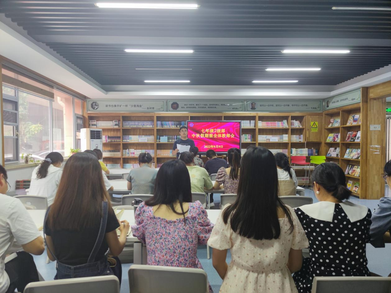 9月9日下午,七年级2级部在立德楼一楼图书室召开中秋假期前全体教师会议暨班主任工作会议,会议由2级部刘纪海主任主讲,七年级2级部全体教师参加。