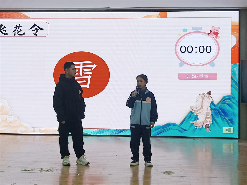 第三关“飞花令” 将比赛推向高潮。团体一等奖班级各派两名代表、二等奖班级各派一名代表,共24人分成4组,每组6人抽签定字,按顺序在10秒内吟出含指定字的诗句,答不出即淘汰,每组第一名晋级决赛,最终决出状元、榜眼、探花、传胪及进士单项荣誉。选手根据抽选字眼逐轮对决,你来我往、佳句频出,尽显个人诗词功底与临场应变能力。