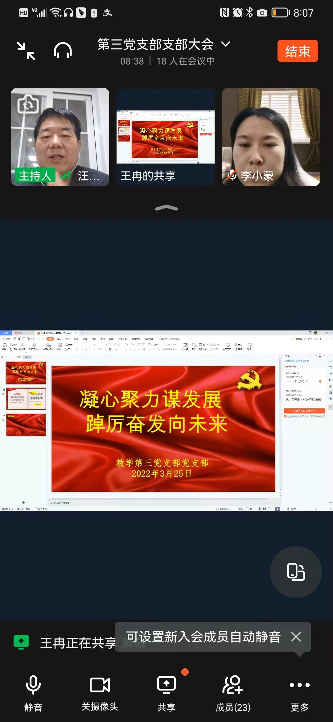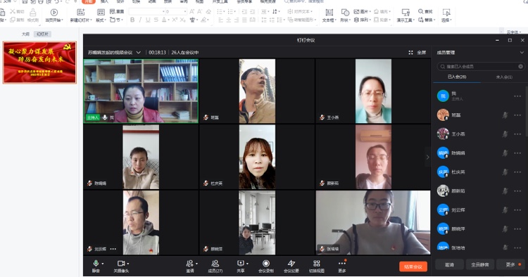在抗击疫情的关键时期,为深入学习贯彻习近平总书记在全国两会期间的重要讲话精神,充分发挥基层党组织的战斗堡垒作用,激励党员同志勇于担当、敢当先锋,提升党组织的凝聚力与战斗力,3月14日行政党支部通过线下,3月25日教学第一、第二、第三、第四党支部通过钉钉视频会议开展“凝心聚力谋发展 踔厉奋发向未来”线上主题党日活动。