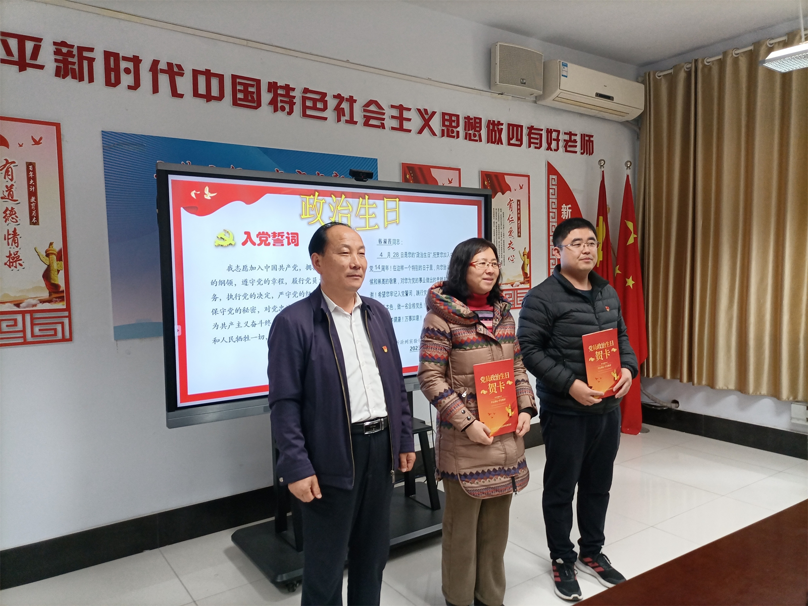 会议第三项,各党支部为4月入党的同志过“政治生日”,由书记为同志们送上“政治生日贺卡”,让党员切身感受到党组织的关心和温暖。