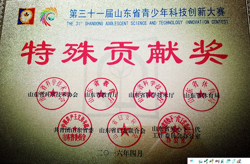 4月15日至17日,第31届山东省青少年科技创新大赛在临沂市青少年示范性综合实践基地举行,我校校共派出五名师生参赛,其中四人获得一等奖、一人获三等奖,并同时荣获大赛组委会颁发的特殊贡献奖,全省仅有临沂市科协、临沂市科技馆、临沂市经济开发区、临沂市青少年示范性综合实践基地等五家单位获此殊荣。