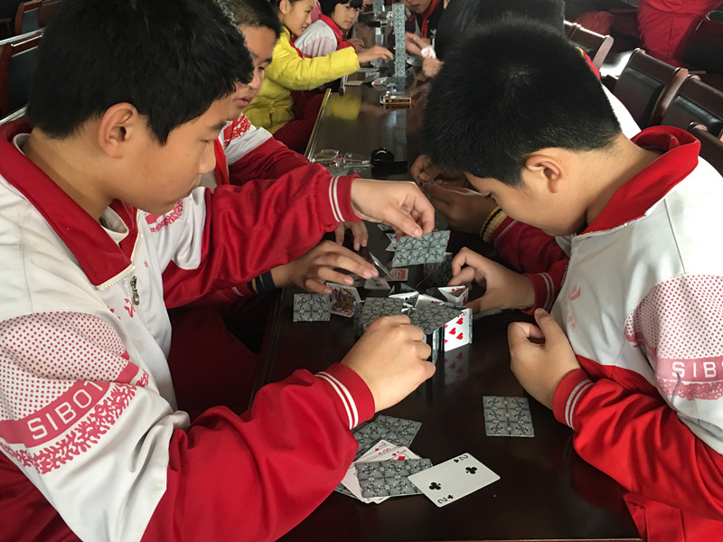 11月24日,我校举行了扑克牌叠高比赛,扑克牌叠高比赛是学校第五届科技节的重头戏,它要求学生自己动脑,在规定时间内,不借助任何辅助工具,扑克牌可以折弯,叠高的样式不受限制,据纸牌倒塌前的最高高度决胜负。