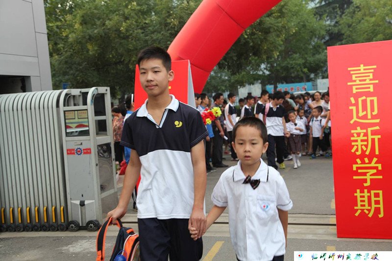 二、牵手参加,带领新生融入集体。在开学典礼上,刚刚步入校园的400多名小学一年级新生,在九年级学哥、学姐的牵手带领下,有序来到操场,融入新的集体,共同参加开学典礼,聆听学校领导讲话,接受师长良好祝愿,了解学校相关要求。让每名新生尽快消除疑虑,适应校园生活,快乐健康成长。