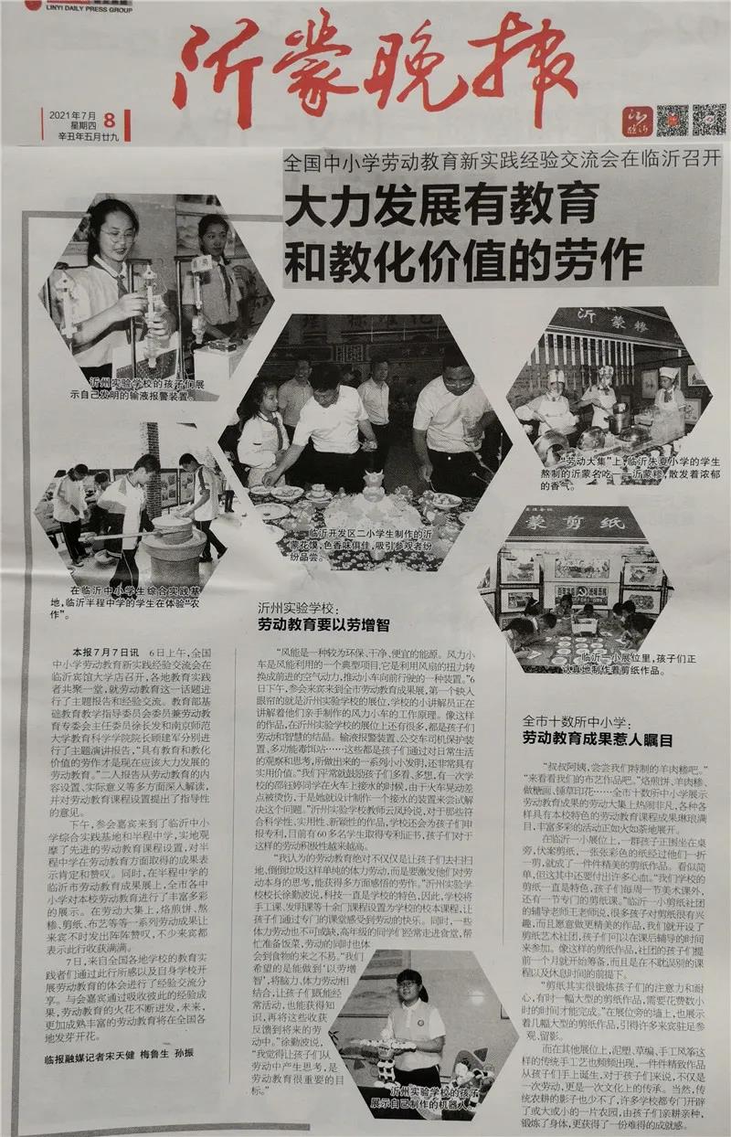 7月6日至7日,全国中小学劳动教育新实践经验交流会议在临沂市举行。临沂沂州实验学校作为科技教育与劳动教育相融合的特色学校受邀在本次会议中进行成果展示。