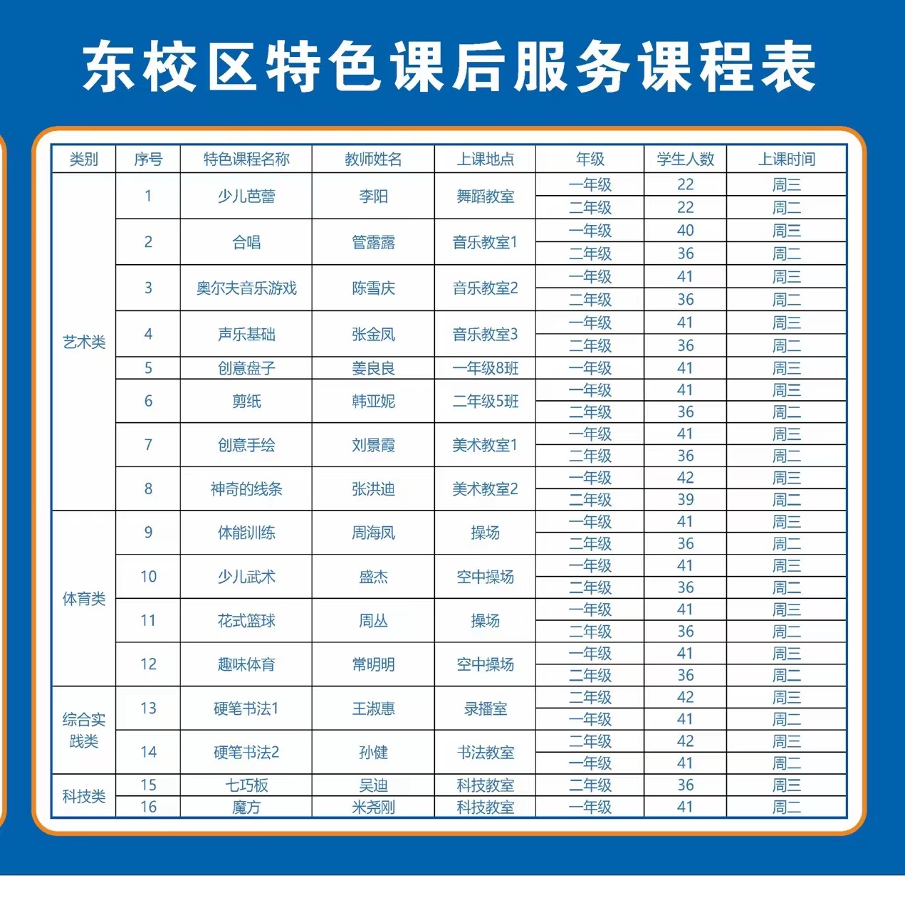 学校设置“1+X”课后服务课程。在“1”课程中,教师辅导学生巩固当天学习任务,做到日日清。对于当天学习的重难点,教师根据学生的实际情况进行有针对性的辅导,真正帮助学生解决学习困难,确保书面作业不出校门。在“X”课程中每周一天无作业日,所有学生都参加选课走班。充分利用优质师资和东校区的场地资源,开展少儿芭蕾、合唱、书法、足球、少儿武术、七巧板等课程,涵盖了人文、艺术、体育、科技等不同内容,供学生自由选择,带领学生悦纳自我,发现自身的无限可能。实现“一班一特色、一生一技能”。