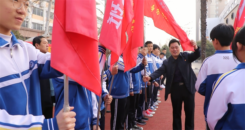 战鼓声声催奋进,旌旗猎猎踏征程。在激昂的战歌声中,党委书记、校长徐勤波为九年级各班授“百日战旗”,同学们满怀激动地从校长手中接过书写着班级口号的战旗,列列战旗在阳光下熠熠生辉,一个个勇士高擎战旗、蓄势待发。授旗仪式最后,徐校长将倾注着殷切期盼的“中考必胜旗”交到八、九年级主任手中,两位主任紧握战旗,迎风挥舞,表达着带领中考年级再创佳绩的决心。在挥舞的战旗下,在铿锵的口号中,现场豪情激荡,气势如虹。此刻,全体中考师生已积蓄力量,蓄势待发。